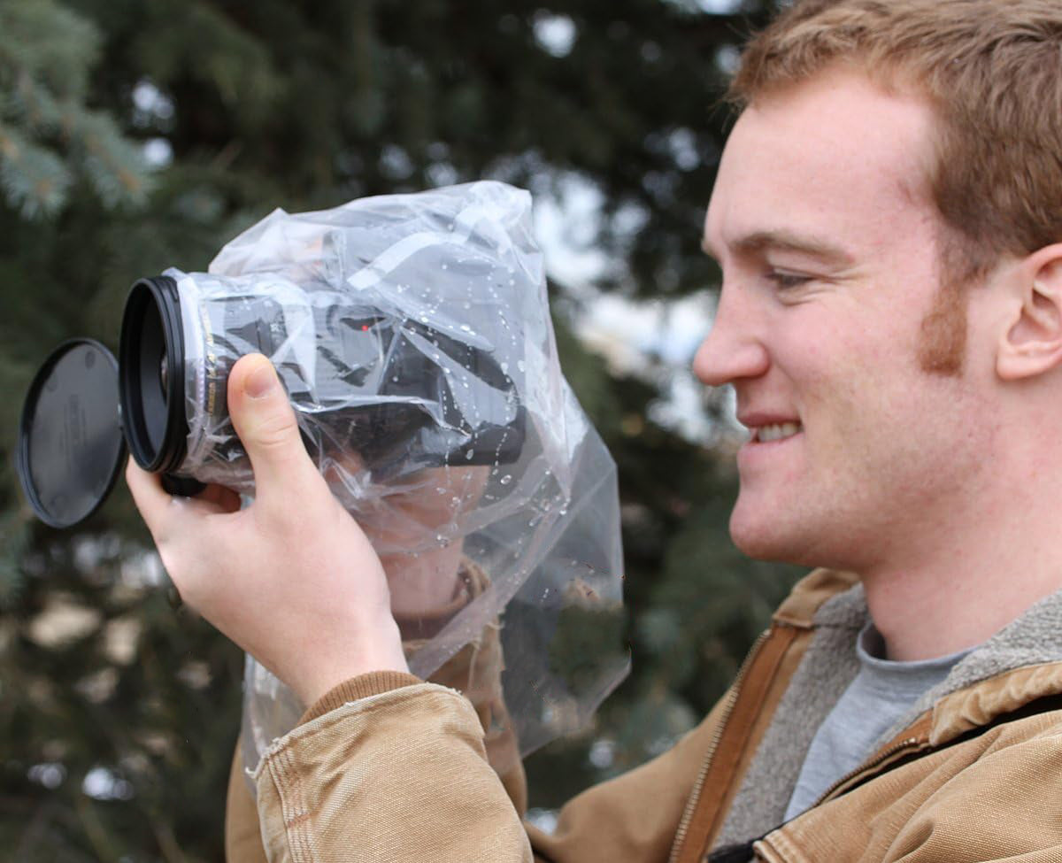 The ZIKKON Rain Cover camera cover is an essential camera gear for outdoor photographers, providing effective protection from rain, snow, and sand. Designed for handheld use or tripod application, it conveniently stores in a pocket or camera bag. The unique eyepiece opening accommodates most viewfinders, allowing composition through the camera lens rather than plastic. Camera and lens controls remain easily visible and operable. Whether used for hand-held shots or on a tripod, the Rain Cover is versatile. Attach the tripod mount or strap Quick Disconnects through the pliable plastic rain cover. The drawstring enclosure ensures a snug fit around the lens, providing additional protection and convenience for various sizes. Durable, versatile, and reusable, the Rain Cover camera cover comes in a package of two, making it a practical choice for photographers in diverse environments.