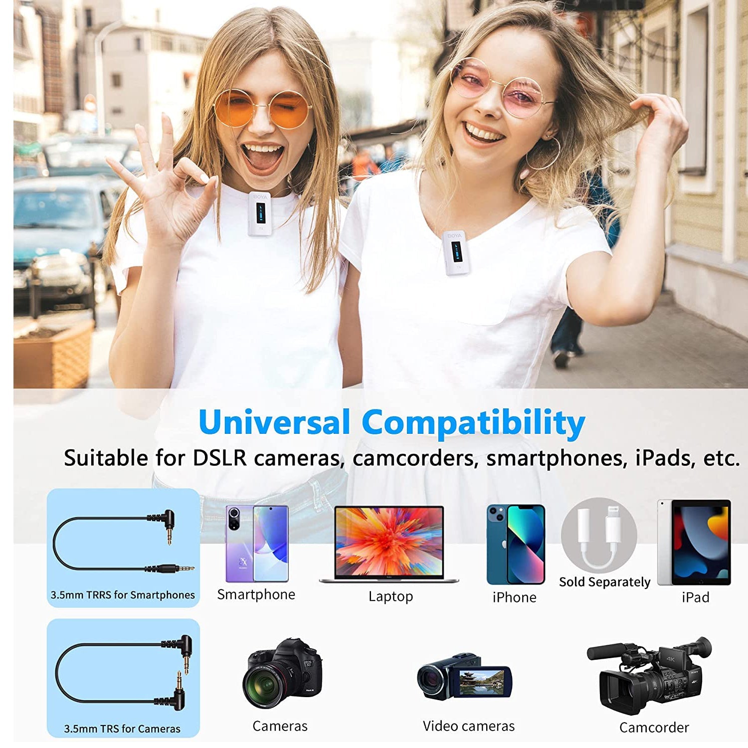 With vivid & easy-to-read OLED display on transmitters and receiver, users can adjust the signal transmission precisely. Moreover the transmitter is also designed with a built-in omnidirectional microphone, so users can clip the transmitter on the collar to pick up sounds, while they can also plug a lavalier microphone into transmitter’s MIC IN jack for sound capturing. Plus, this microphone kit is equipped with both 3.5mm TRS-TRS audio cable as well as a 3.5mm TRS-TRRS audio cable. So it can work well with your DSLR or mirrorless camera, smartphone or computer etc.