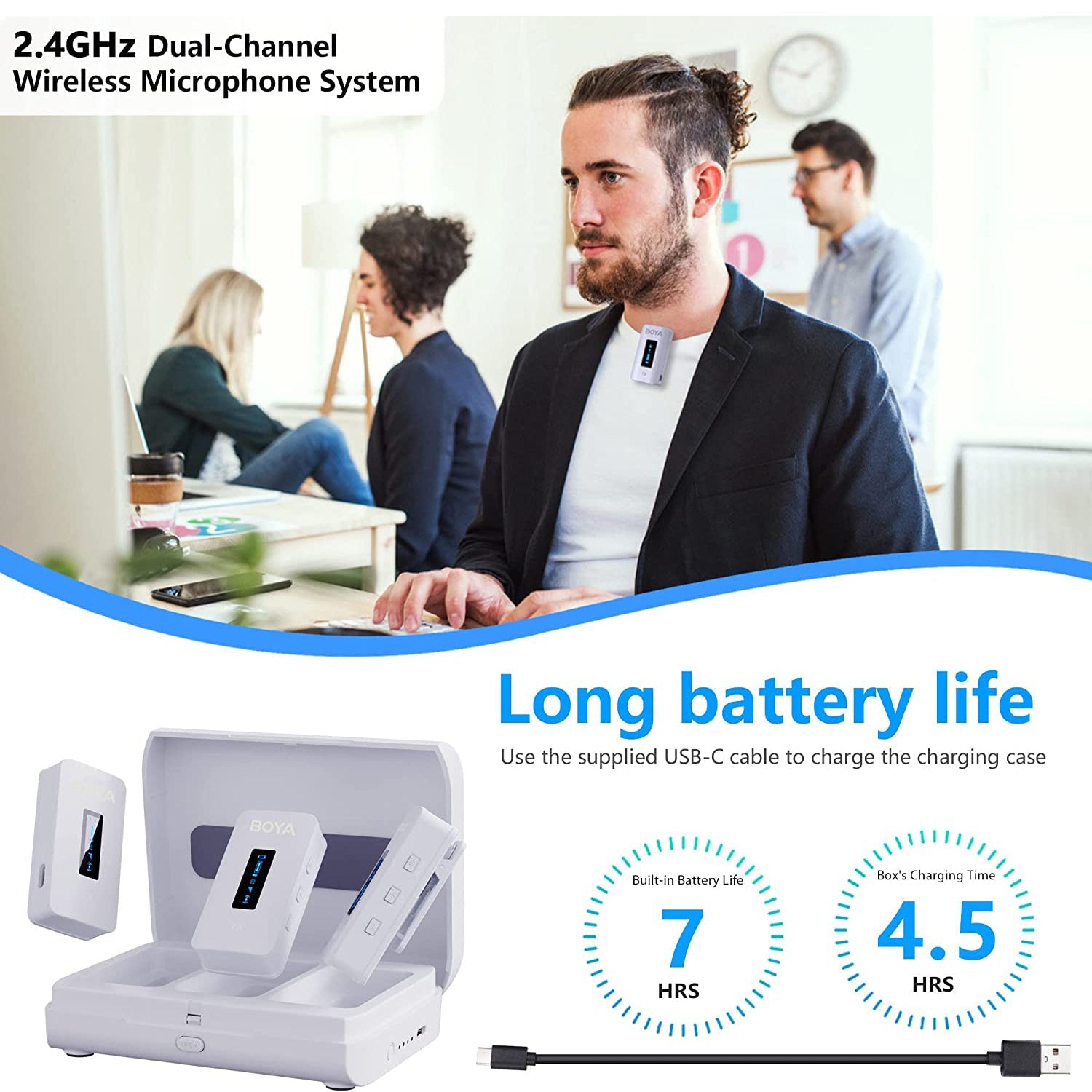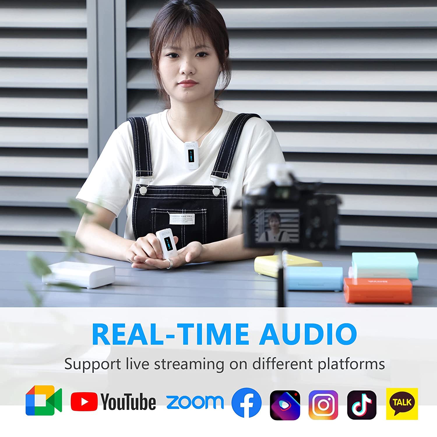 The BOYA BY-XM6-K2, a 2.4GHz adaptive frequency hopping wireless microphone system, consists of two transmitter, one receiver, as well as a charging case. It’s a perfect sound capturing, meanwhile delivering solution for two-person vlog, YouTube video, live streaming, interview, recording, etc.