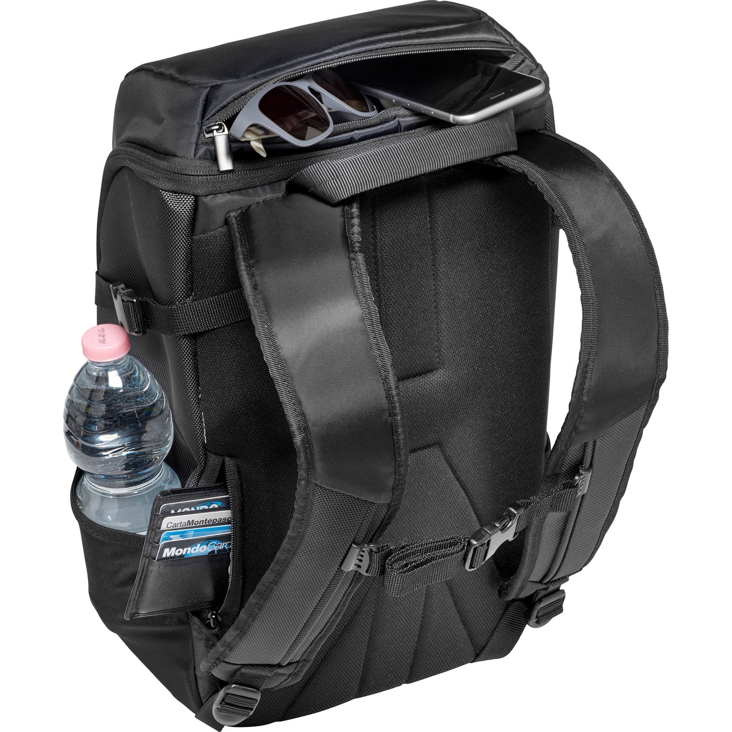Comfortably carry, store and protect your camera gear, personal belongings, and a laptop or tablet in the black Advanced Camera Backpack Compact 1 for CSC from Manfrotto. This well-designed pack has a zippered, top compartment with an insert for holding a mirrorless camera, up to four lenses and related accessories, and a lower compartment for personal items. Behind the top compartment is a padded sleeve for an up to 13" MacBook or 12.9" iPad Pro. For weather protection, the front of the pack has a large flap that covers two, exterior, zippered, accessory pockets. Enhanced security is provided by the ability of key zipper pulls to store behind your back.