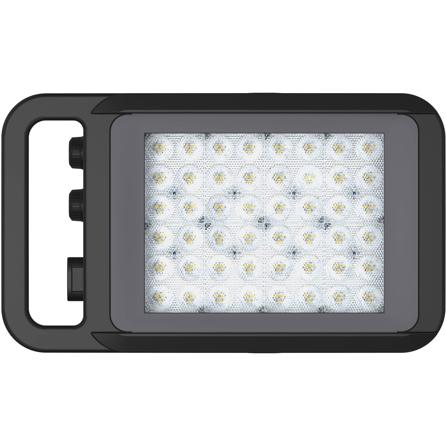 The 48 SMT LEDs (Surface Mount Technology), designed for improved optical efficiency, feature a >93 CRI high color accuracy and provide 1500 lux max brightness at 3.3 ft. The color-temperature is adjustable by a dial on the side from 3000K tungsten to 5600K daylight, and this will allow for use in different environments. Brightness is adjustable flicker-free by a 100-0% dimmer next to the color dial.