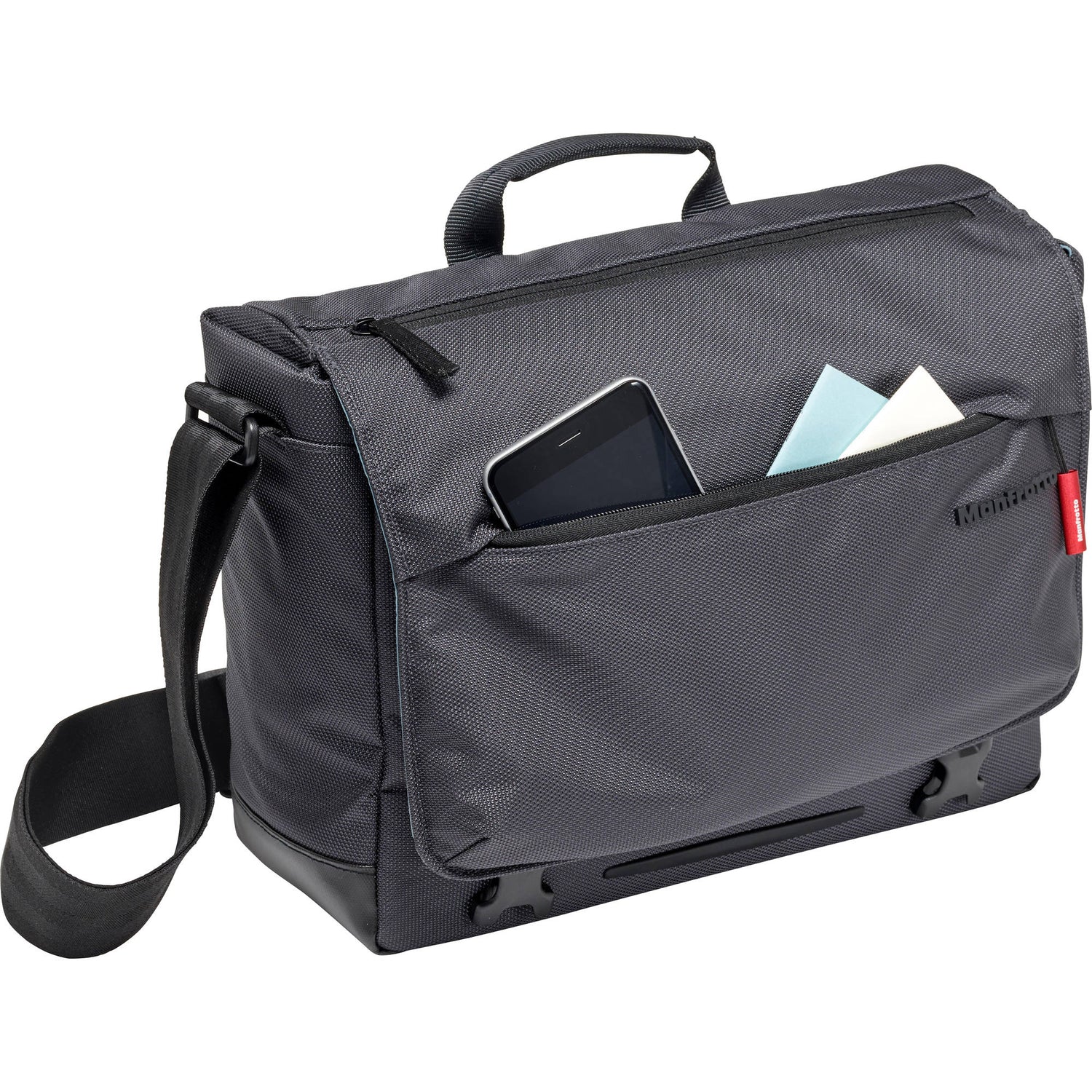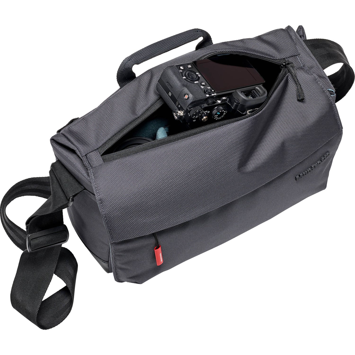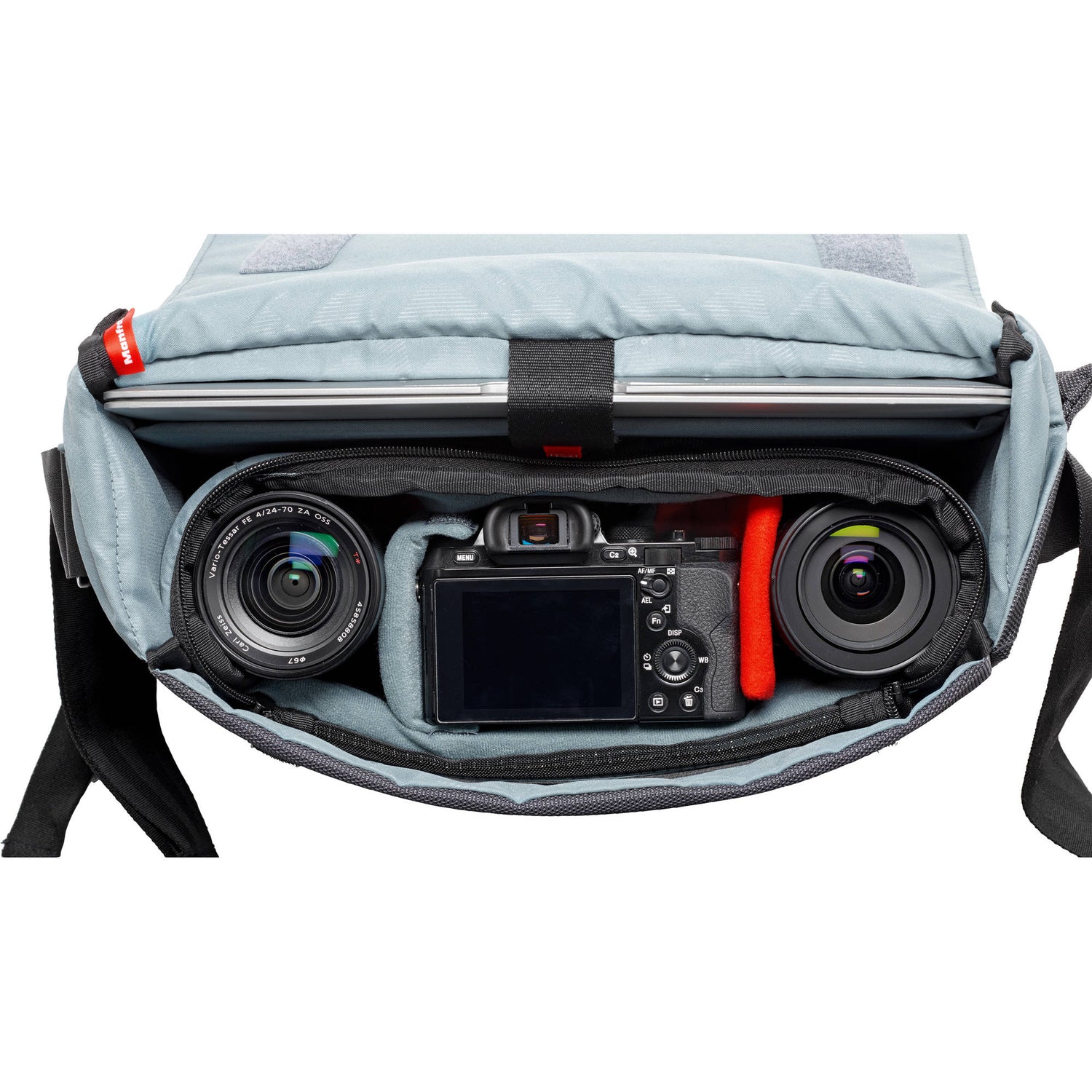 Store, transport, and protect your premium mirrorless camera with standard zoom lens attached, two additional lenses, and related accessories with the gray Manhattan Speedy-10 Camera Messenger Bag from Manfrotto. The bag features a large front flap with buckle closure and a top zipper for easy access to gear. Padded, touch-fastening dividers make organizing gear fast and easy. Front, back, and side pockets provide plenty of space for small items. Inside the bag is a padded compartment for an up to 12" laptop or 12.9" iPad Pro.