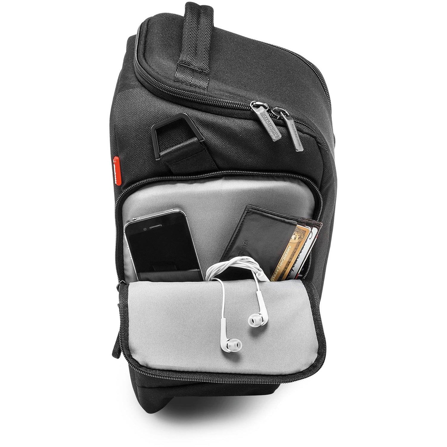 The Pro Holster Plus 50 from Manfrotto holds a DSLR with a battery grip, an attached 70-200 f/2.8 lens, an additional lens, and a flash between rigid, touch-fastened dividers inside the main compartment. The bag is made with a multi-layered construction and a front shield that better diverts impact away from the middle of the bag. The red dividers provide a thick, shock-absorbing core to withstand impact and prevent damage to your gear. The dividers also feature a flexible piece that can create an additional internal section.