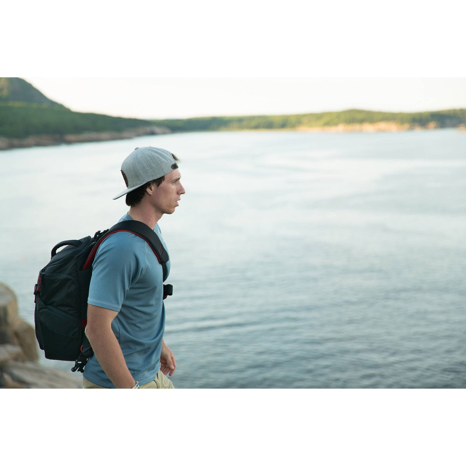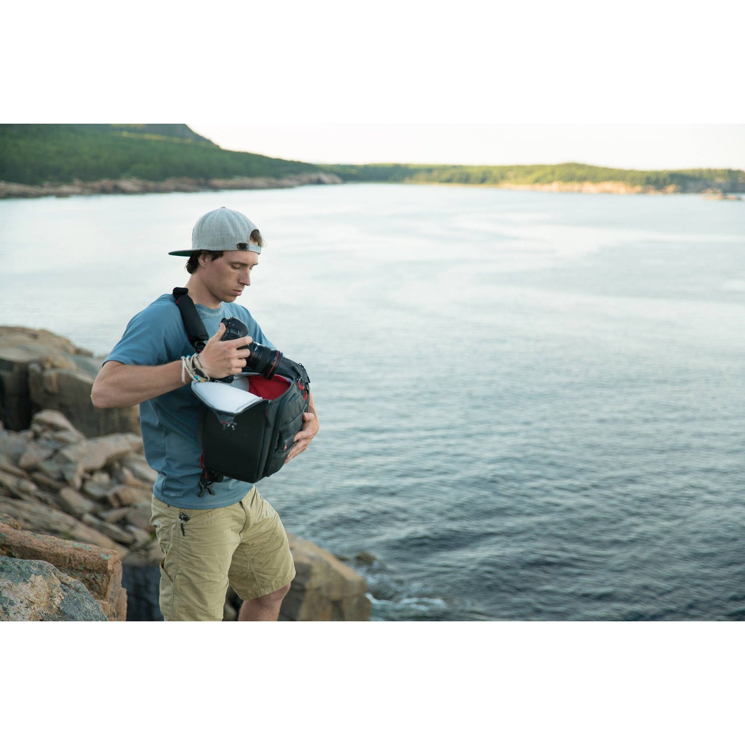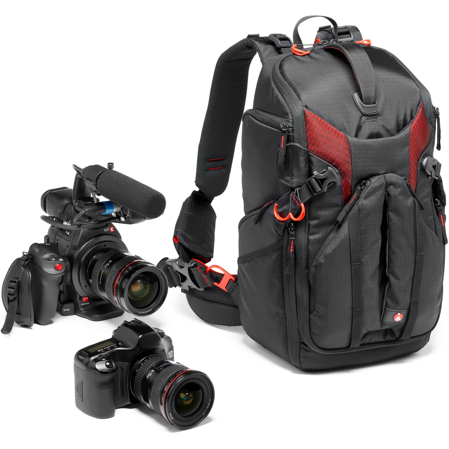 The water-repellent, black with red Pro Light 3N1-26 Camera Backpack from Manfrotto holds a DSLR, up to five lenses, and a flash between padded, touch-fastened dividers inside a triple-entry camera compartment at the base. Since the modular backpack harness converts from a left-handed to right-handed sling, there are three options for entry into the camera compartment: one from the left side, one from the right side, and one from the middle. Each option can be opened while the others stay closed, or the entire compartment can be opened at once.