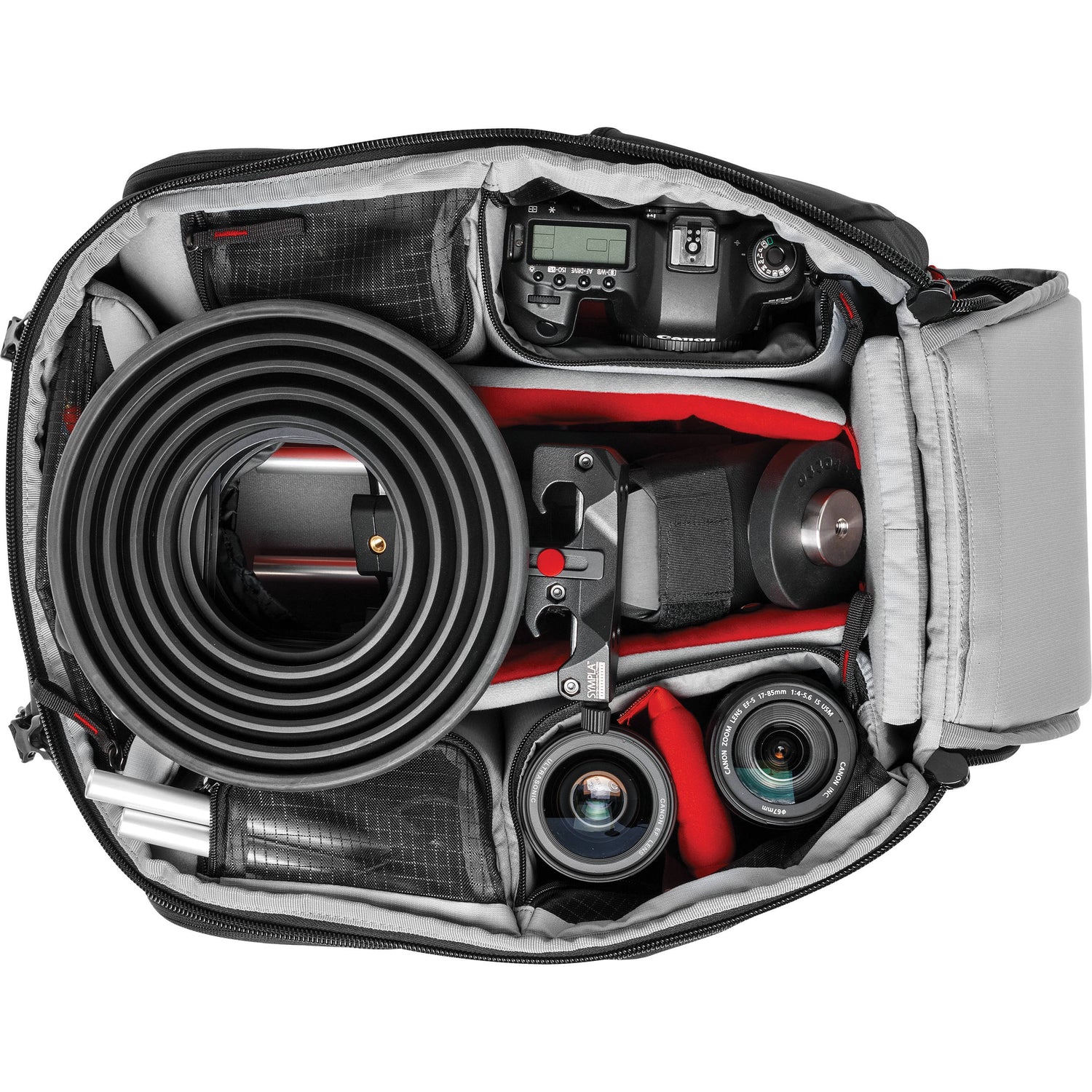 The front of the bag unzips to access the main compartment which has four padded pouches to store your gear in, as well as a large center section that features Manfrotto's Camera Protection System (CPS). The CPS dividers are movable, and are made from three layers to provide maximum protection: a brushed-fabric exterior, a shock-absorbing foam, and a structural reinforcement board. The CPS's design concentrates its protection in the center of the bag, where it is needed the most.