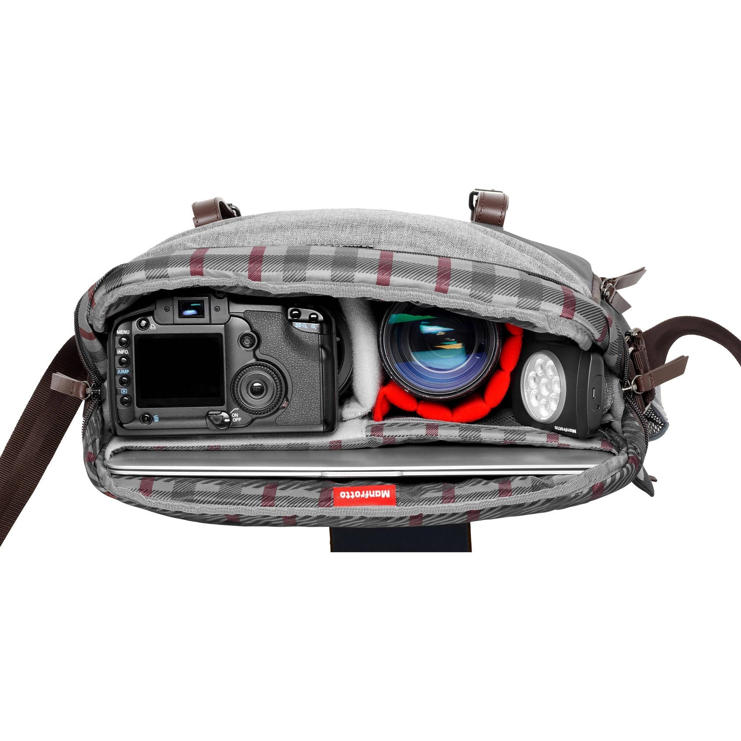 With vintage styling, genuine, brown leather accents and a handsome Tartan lining, the gray Windsor Camera Reporter Bag for DSLR from Manfrotto is designed to store, protect and transport your gear in luxury. The bag features a removable, padded insert with touch-fastening dividers for organizing a DSLR or mirrorless camera with an attached 24-70mm, 70-200mm, an extra lens and related accessories. Top zipper opening provides access to equipment. Inside the rear of the bag is a padded, dedicated compartment for your 13" laptop or tablet.