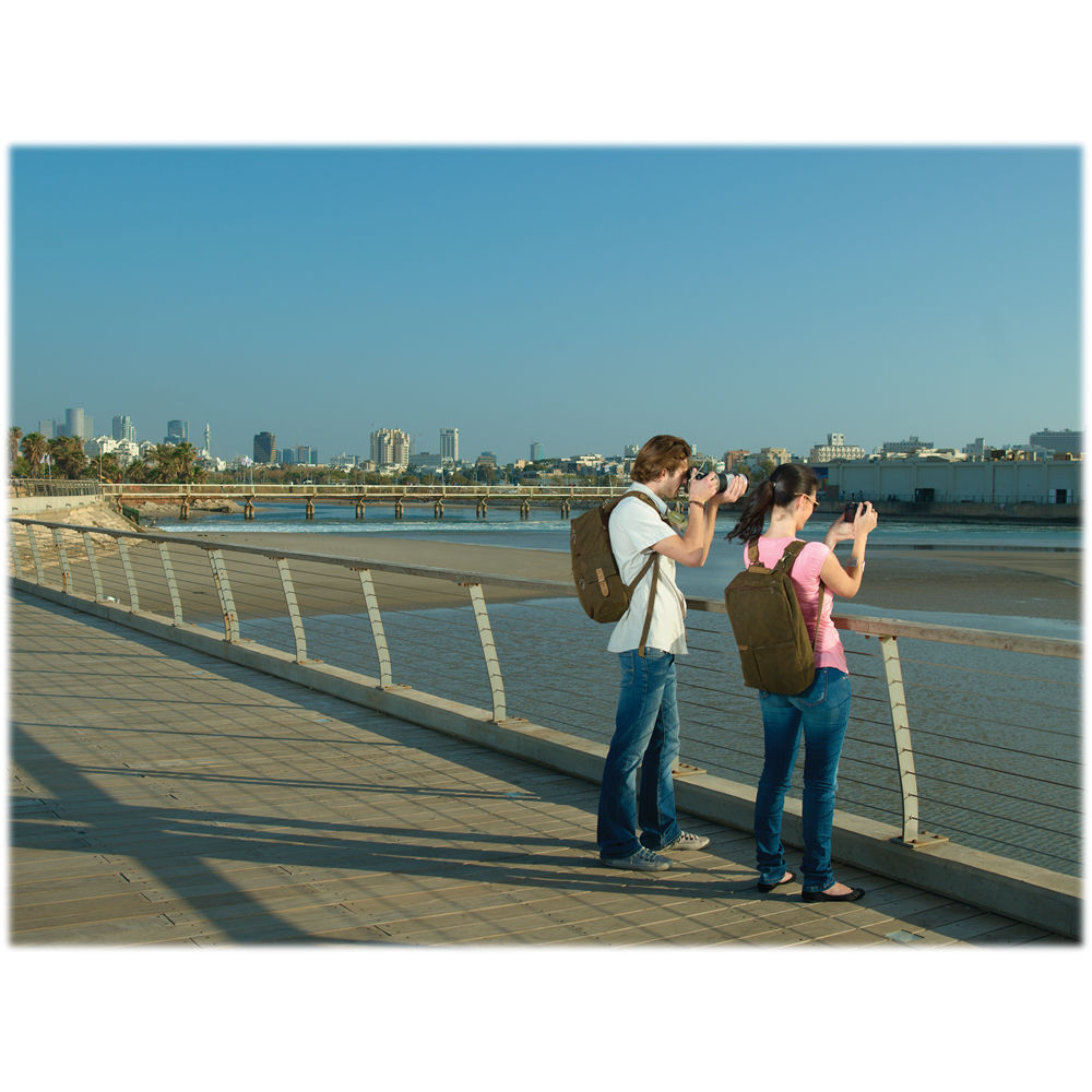 The brown National Geographic NG A5270 Africa Series Medium Rucksack is designed to carry and protect a D-SLR camera or camcorder with media and accessories. A padded rear compartment can hold a laptop computer with a screen up to 15.4". A lower padded compartment holds the camera or camcorder gear. An upper storage compartment holds personal necessities. It is made from water repellent 100% cotton with a padded interior. It has a water repellent 100% polyester lining. There are 2 side pouches that can be used to support a tripod or water bottle. The pack also has 2 easy-access pockets for accessories. It is carried by backpack straps with a sternum strap. Padded, breathable fabric on the back ensures cool comfortable carrying.