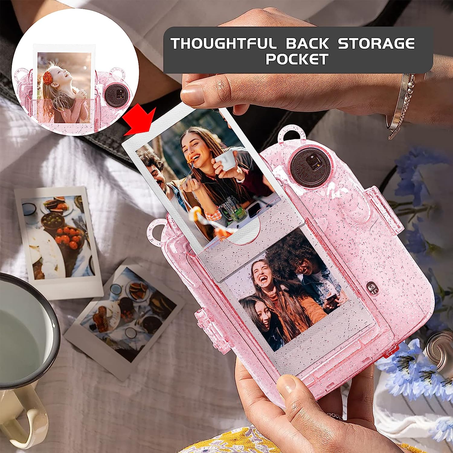 Zikkon Instax Mini 12 Protective Glitter Case Photo Storage Pocket with Shoulder Straps + Stickers set