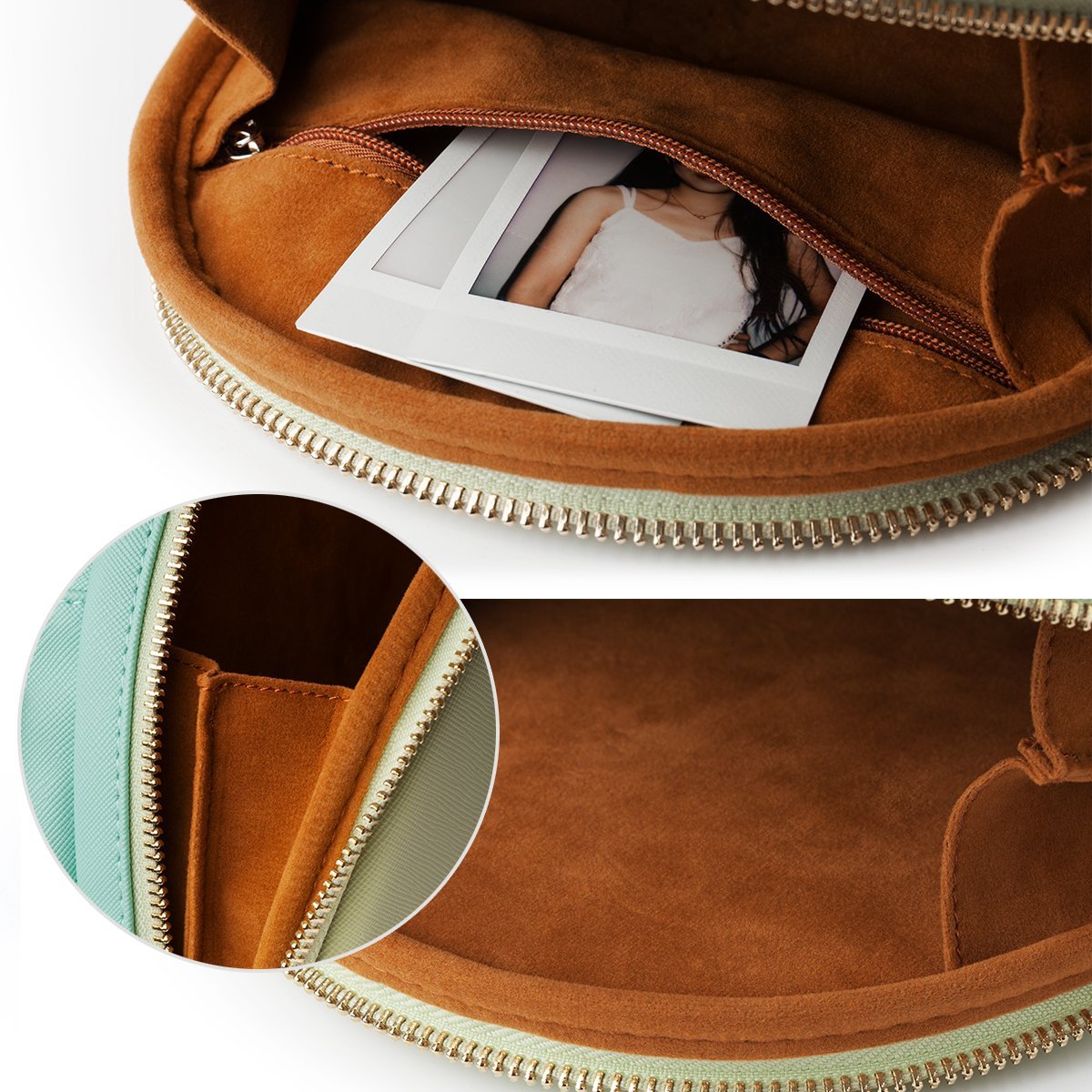 This particular bag features two outside zippered pockets, one for camera, suitable for instax mini camera and smartphone printers