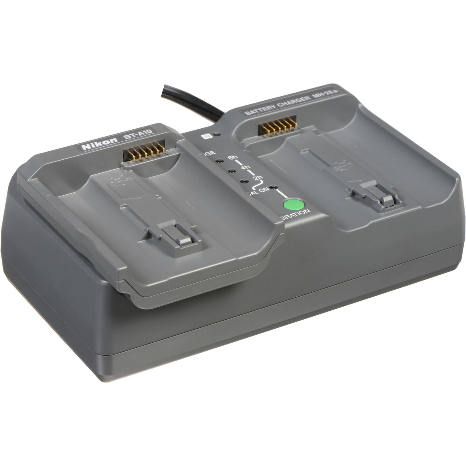 The Nikon MH-26aAK Adapter Kit includes a BT-A10 adapter and an MH-26a dual battery charger. The MH-26a charges and calibrates the EN-EL18, EN-EL18a, and EN-EL18b Li-Ion batteries for the D4 and D4S cameras, and MB-D12 battery pack. The adapter attaches to one of the slots on the MH-26a and charges the EN-EL4 and EN-EL4a Li-Ion batteries for the D3 series cameras, and the MB-10 and MB-40 battery packs.